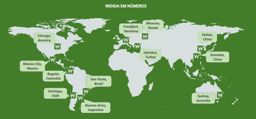 Na América Latina, Estados Unidos, Turquia, Rússica, Ásia-Pacífico, etc, a Wenda possui equipes e instalações locais para atender seus clientes através de importação direta ou fornecimento local. O modelo de negócio ágil e direto é um dos diferenciais da empresa até hoje, somado ao conhecimento técnico, as soluções sob demanda e a credibilidade, que transformaram a empresa em referência nacional e internacional.